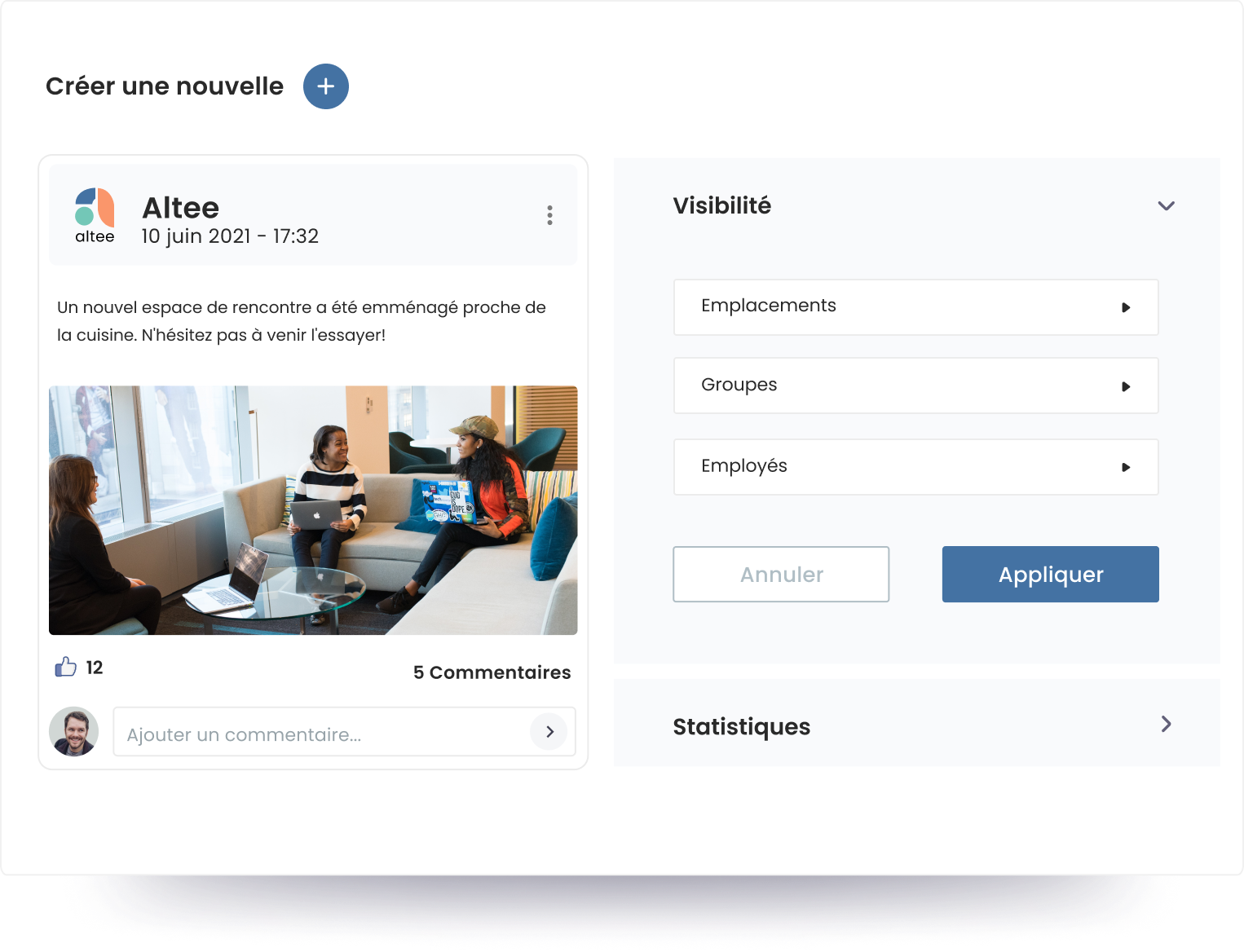 Vous avez la possibilité de déterminer qui dans votre entreprise voit vos nouvelles en répartissant l’information par bureaux, groupes ou employés.